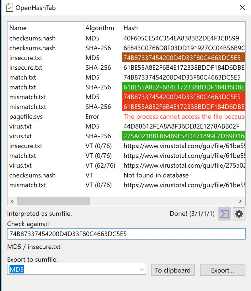 - OpenHashTab 会自动与当前文件的哈希值进行对比,如果一致(默认显示为绿色),说明文件完整且未被篡改。